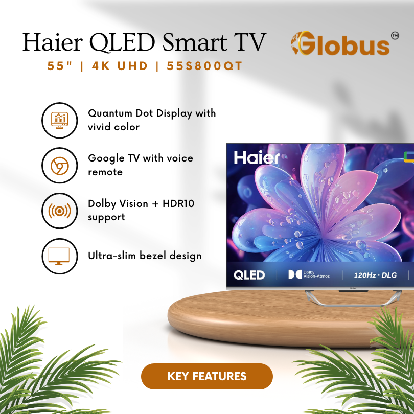 The Haier 55S800QT 55″ 4K Ultra HD QLED Smart Google TV combines cutting-edge technology with elegant design to transform your viewing experience. Its QLED panel delivers vibrant colors and deep contrasts, enhanced by Dolby Vision for stunning picture quality. Dolby Atmos provides immersive audio, making every scene come alive. With Google TV, access a vast array of streaming services and apps, all navigable through an intuitive interface. Hands-free voice control via Google Assistant allows effortless operation—search content, control smart home devices, or get information with simple voice commands. The TV’s sleek, bezel-less design not only adds a modern touch to your space but also maximizes the screen area for an enhanced viewing experience. Connectivity options include 4 HDMI ports, 2 USB ports, Bluetooth, and Wi-Fi, ensuring seamless integration with various devices. Whether streaming your favorite shows, gaming, or browsing, the Haier 55S800QT offers a comprehensive and user-friendly entertainment solution.
