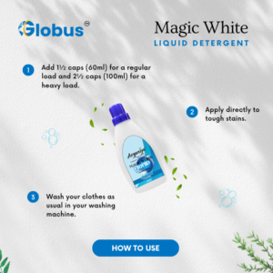 Magic White Detergent is a premium liquid laundry solution designed for effective and safe cleaning of all fabric types. Its concentrated formula combines mineral-based and plant-derived cleansers to lift dirt and tough stains while protecting the fabric’s texture and color. Ideal for both hand and machine washing, this detergent ensures a deep clean without causing fabric damage or skin irritation. The quick-dissolving liquid blends easily in water and rinses off completely, leaving no residue. With regular use, clothes remain soft, fresh-smelling, and visibly brighter.