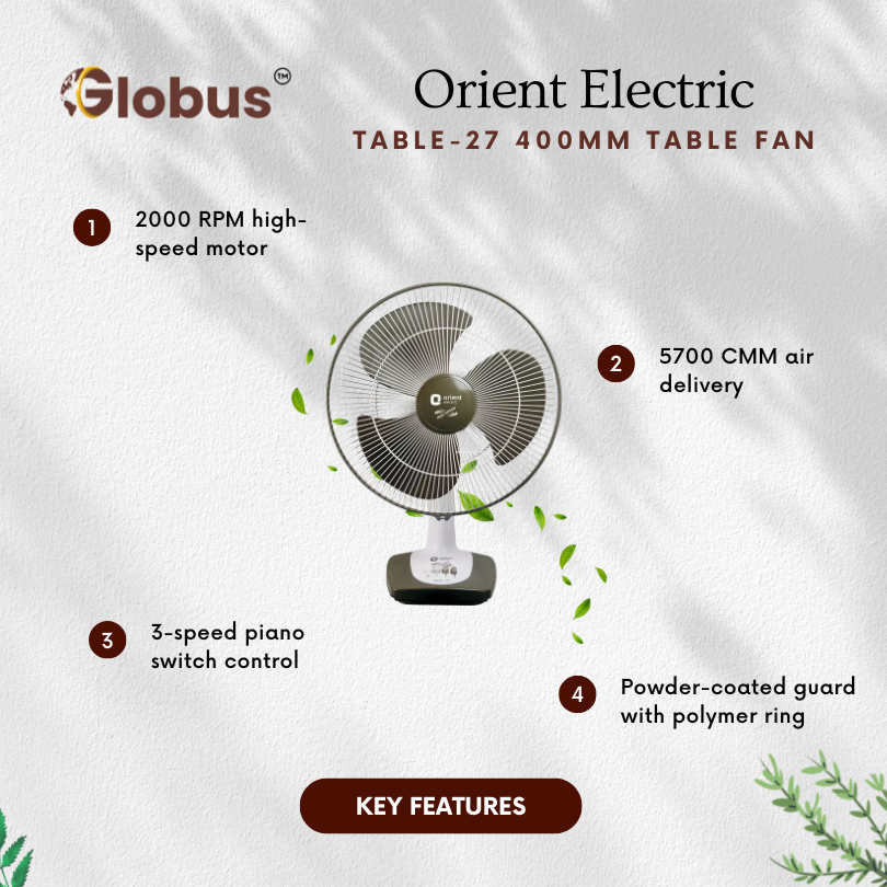 The Orient 400mm Table Fan 27″ High Speed Ultra Power is engineered to provide robust and consistent airflow, ideal for personal and small room cooling. Featuring a 400mm blade diameter, it maximizes air circulation while maintaining low noise levels. The fan’s high-speed motor ensures rapid cooling even on the hottest days, while its sturdy construction guarantees long-lasting performance. Designed for versatility and ease of use, this table fan includes adjustable tilt settings to direct airflow precisely where you need it. Its compact footprint makes it an excellent choice for desktops, study areas, or bedside tables, blending seamlessly with any room décor. Additionally, the fan’s energy-efficient motor helps keep electricity bills low without sacrificing performance.