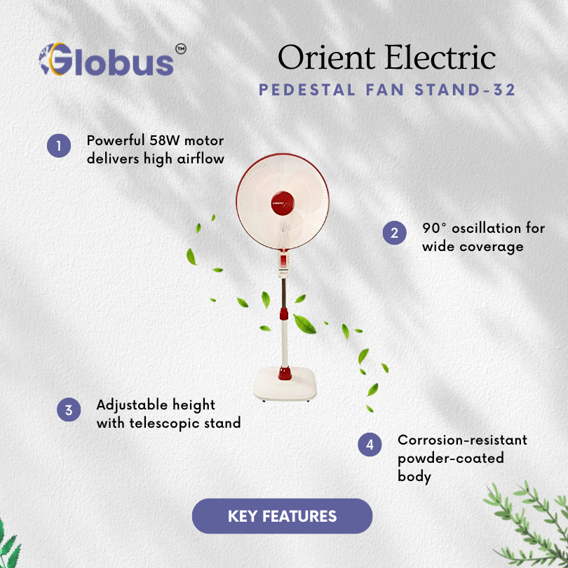 Built with a sturdy and stylish cream, red, and white body, this fan complements diverse interior aesthetics. The powder-coated guard provides durability and corrosion resistance, ensuring long-lasting performance. Easy to assemble and maintain, the Orient Stand-32 is a dependable choice for consistent cooling.