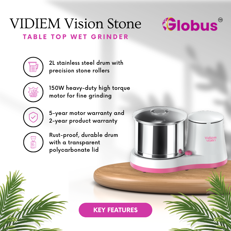 The Vidiem Vision ST is a 2-litre tabletop wet grinder designed for efficient and hygienic grinding. Equipped with a 150W high-torque motor, it features extra-wide stone rollers, a rust-proof stainless steel drum, and a transparent polycarbonate lid, making it ideal for preparing batters and pastes in Indian kitchens.