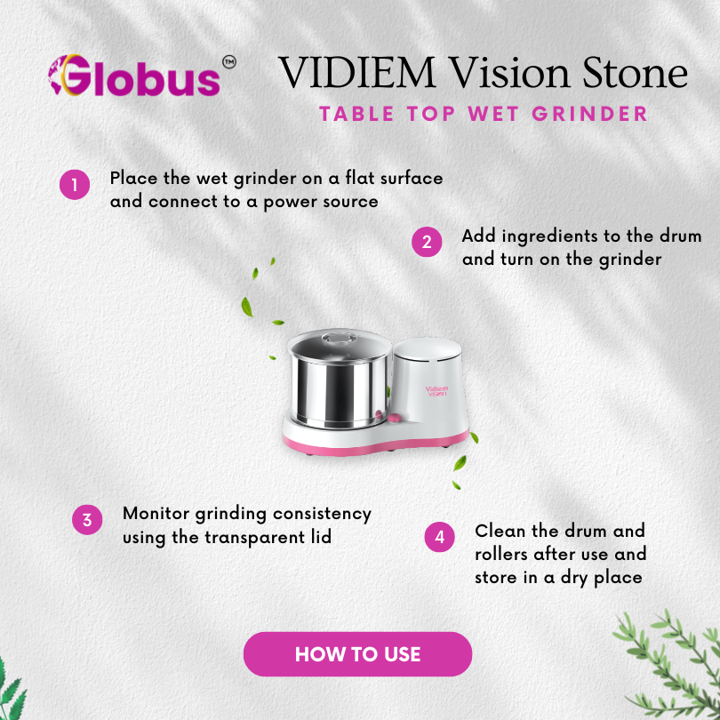 The Vidiem Vision ST Table Top Wet Grinder combines robust performance with user-friendly features. Its 2-litre capacity is suitable for medium to large families. The grinder is powered by a 150W single-phase high-torque induction motor, operating at 1350–1450 RPM, ensuring faster and finer grinding.